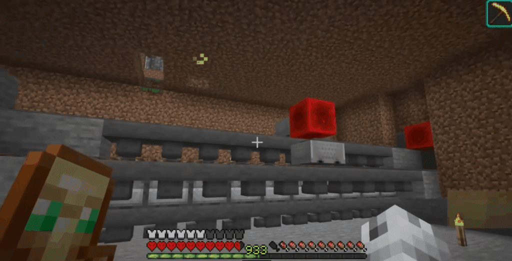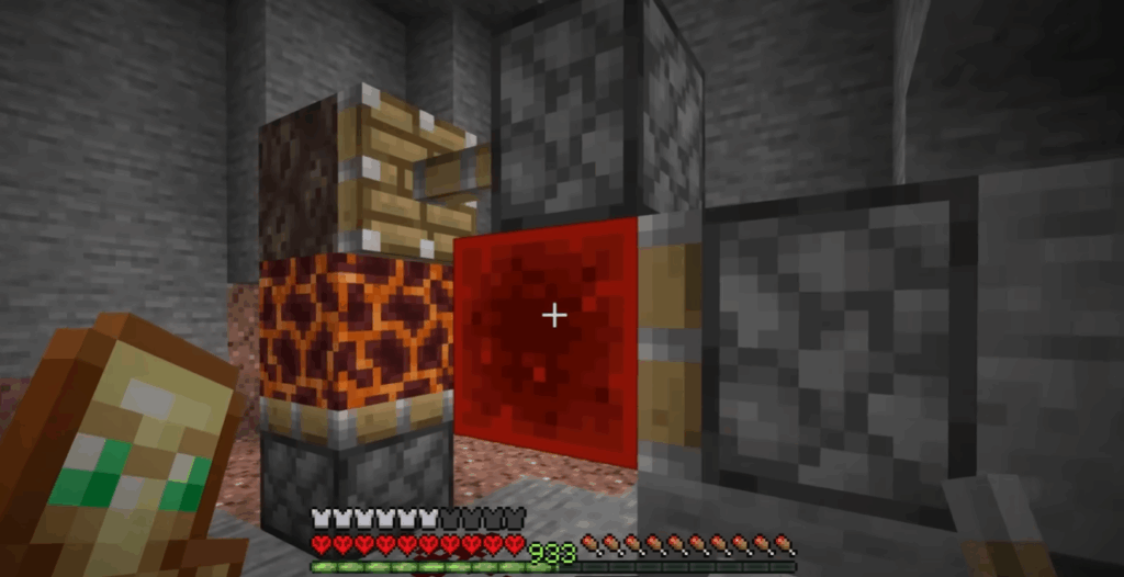 La Estrategia de Construcción: Al excavar tres huecos en el suelo y colocar a los aldeanos justo debajo de estos objetos, el juego permite que interactúes con ellos a través del espacio "vacío" de la hitbox del bloque superior.